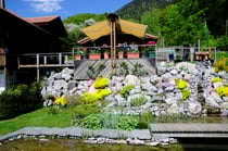 Durch den Felsengarten gelangt man über einen kleinen Steig auf die Terrasse. Unterwegs überquert man einen Bachlauf, begegnet verschiedenen Steingarten- gewächsen