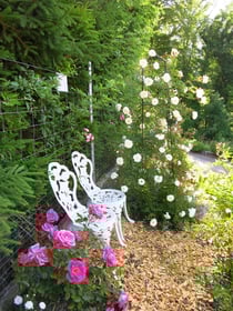 Sie betreten nun unseren Mondgarten. Inspiriert durch mondhelle Nächte haben wir die Bepflanzung in diesem kleinen Gartenraum in den kühlen Farben blau und weiß gehalten. Unterstrichen wird dies noch durch die silberfarbene Blatttextur einiger Pflanzen. Auch die Beleuchtung durch LED`s wirkt sehr kühl. Der Duft der Rosen „Annapurna“, „Schneewittchen“ ,Schneeflocke und „White The Fairy“, der Katzenminze und des Lavendels sorgt jedoch gerade an lauen Sommerabenden auf der Terrasse für eine wunderbare, sommerliche Stimmung. Nehmen Sie sich einen Augenblick Zeit, atmen Sie einige Male tief durch und spüren Sie die hier herrschende Ruhe und Leichtigkeit...